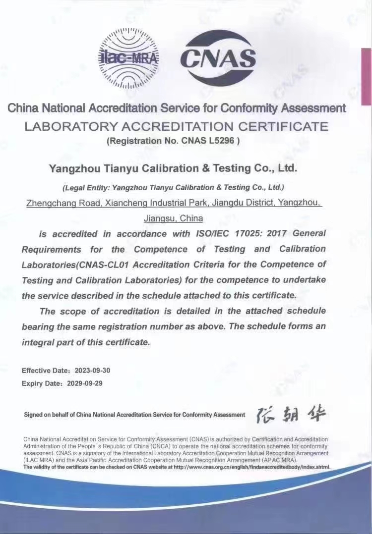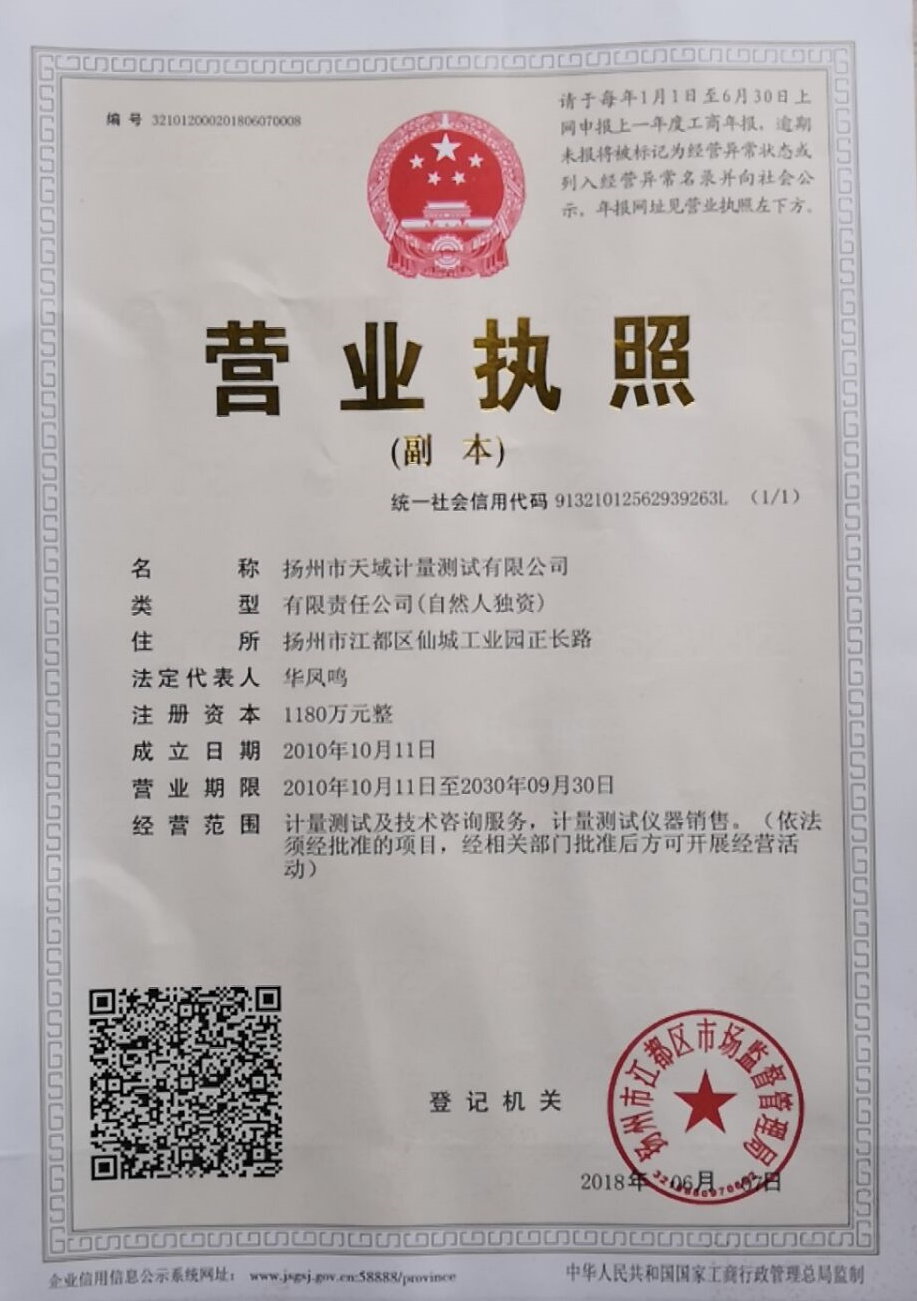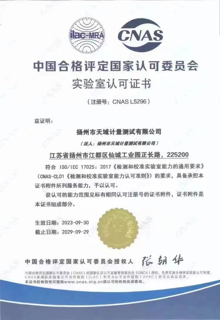 揚(yáng)州市天域計(jì)量測試有限公司,坐落在交通便利的揚(yáng)州市江都區(qū)仙城工業(yè)園,成立于2010年10月,2011年11月正式獲取中國合格評(píng)定國家認(rèn)可委員會(huì)認(rèn)可(授權(quán)),注冊(cè)號(hào):CNAS L5296。近幾年的發(fā)展,實(shí)驗(yàn)室已具備了較大規(guī)模,并形成了集計(jì)量器具檢測,計(jì)量技術(shù)咨詢和計(jì)量器具銷售為一體的專業(yè)化技術(shù)機(jī)構(gòu),客戶覆蓋蘇南、蘇北、和浙江,安徽部分地區(qū),客戶群總量達(dá)到了上千家企事業(yè)單位。實(shí)驗(yàn)室建立健全了一套較為完整的內(nèi)外部質(zhì)量管理體系,至今未發(fā)生糾紛和客戶投訴事件。